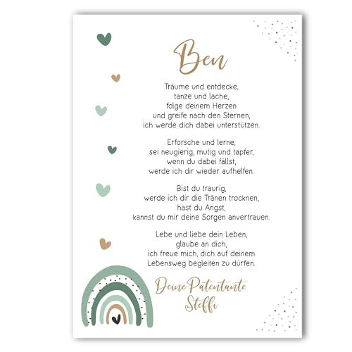 Taufgeschenk Kunstdruck | Taufe Poster | personalisiert | Patenbrief Patenkind | Regenbogen | Junge oder Mädchen (Grün)