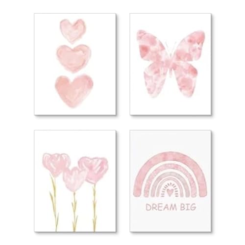 Ueiwffzo 4er Poster Set Bilder Set DIN A4 Rosa Regenbogen Bilder Herz Kinderzimmer Mädchen Leinwand Bilder Wandbilder, Ohne Rahmen Wandposter Babyzimmer Deko
