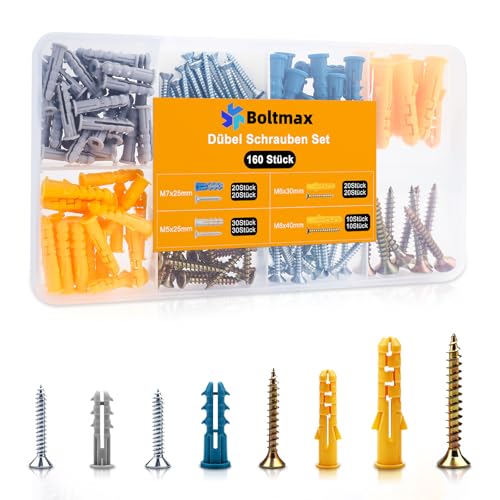 Boltmax 160 Stück Dübel Schrauben Set, Dübel Set mit Schrauben, Rigips Dübel in verschiedenen Größen, Hohlraumdübe für Profis und Heimwerker zur Befestigung an Gipsplatten, Beton und Ziegel