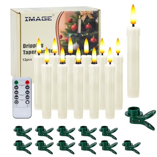IMAGE 12-teiliges LED-Kerzenset (13,5 cm), flammenlose Elfenbeinkerzen mit 3D-Tropfoptik, mit Christbaum-Clip, 10-Kanal-Fernbedienung mit Timer, warmweiß, batteriebetrieben.