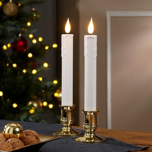 EUROtops LED-Kerzenset mit flackernder Flamme und Timer – elektrische Stabkerzen im goldenen Kerzenhalter, warmweißes Licht für Fensterbank oder Festtafel