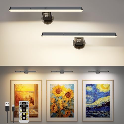 Bilderleuchte Kabellos LED Bildbeleuchtung Akku, 31cm 6000mAh Wandleuchte Ohne Stromanschluss,Dart Beleuchtung Licht 3 Farbtemperaturen Dimmbar mit Fernbedienung&Timer, für Malen,Foto,Portrait-2 Stück