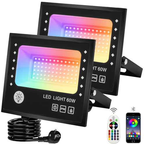 60W RGB LED Strahler Fluter Außen,Spotlight mit Fernbedienung Bluetooth APP,16 Million Farben und DIY-Strobe-Modus,Timing,Flutlicht im Freien 6000LM,IP66 Außenstrahler,2 Stück