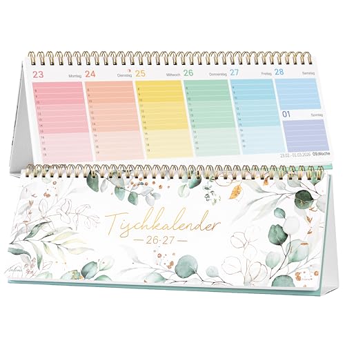 Tischkalender 2026 2027 - Wochenkalender 2026 2027 von März 2026 bis August 2027, 1 Woche 2 Seiten, Kann flach stehen oder liegen, 29,5 x 10,5 cm, Grün