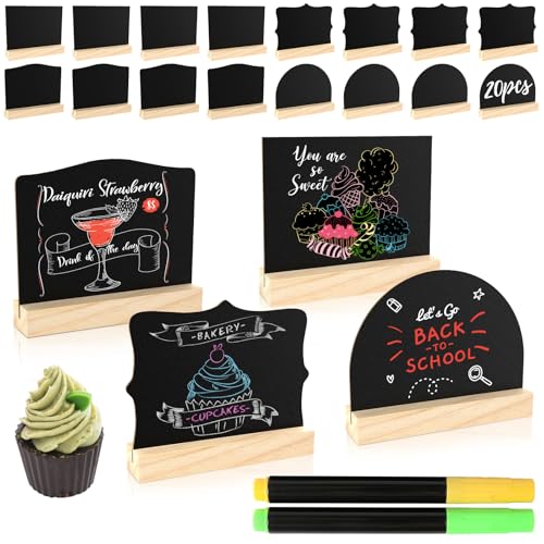 Holzkreidetafel, 20 Stück Mini Kreidetafel, 4 Stile Kleine Tafeln zum Beschriften, Abwischbare Buffet Schilder Preisschilder Aufsteller Getränkekarte für Bar Café Geburtstag Hochzeit (7.5 x 10cm)