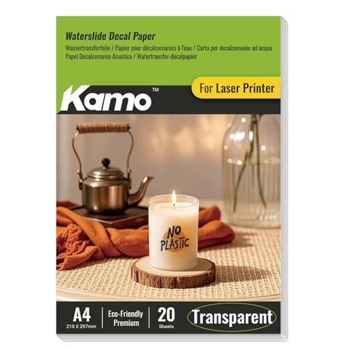 Kamo Wasserschiebefolie Transparent A4 für Laserdrucker – 20 Blätter Decalfolie für Keramik, Glas, Tassen, Kerzen, Kunststoff und Modellbau DIY Projekte