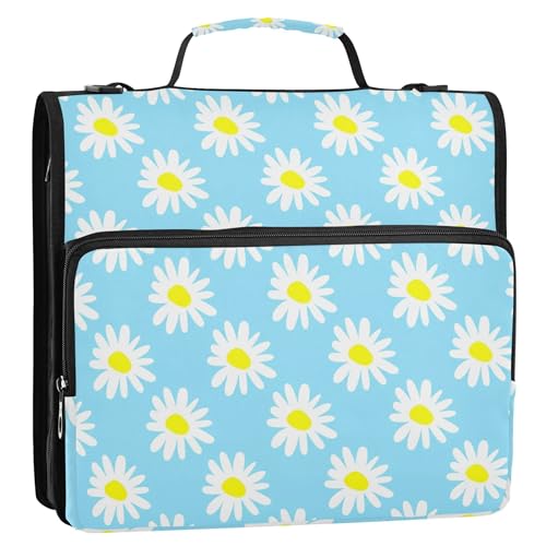 3,8 cm große Ordner mit 3 Ringen, strapazierfähig, weiße Gänseblümchen, Blumenmuster, hellblau, Reißverschluss, Ordnertasche mit Gurt für Schule, bunte Aufbewahrung, Portfolio-Ordner mit Griff