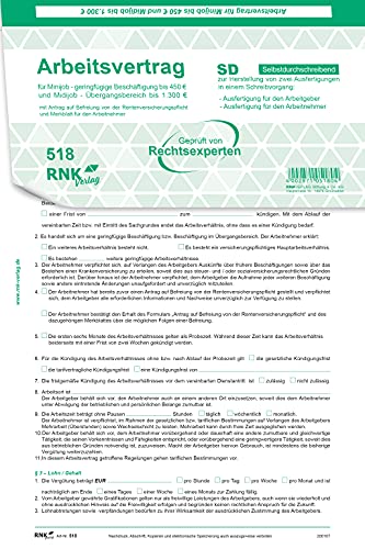 RNKVERLAG 518 - Arbeitsvertrag für geringfügig und Teilzeit Beschäftigte - SD, 2 x 2 Blatt + Zusatzblatt, DIN A4, 1 Stück