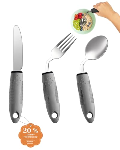 CuraVita Adaptives Besteckset (3-teilig) – 42° gewinkelt, 85 g gewichtetes Besteck bei Parkinson, Handzittern und Arthritis – ergonomische Esshilfen mit rutschfestem Griff (Rechtshänder)