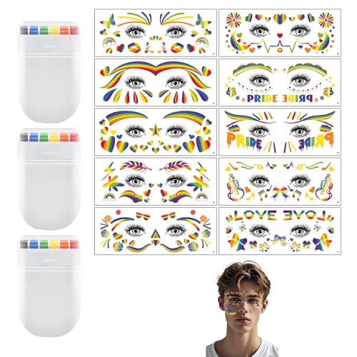 Pride Tattoos – 10 temporäre Regenbogen-Gesichtstattoos mit 3 Doppelseitigen 6-Farben Markern für Festivals, Partys und LGBTQ+ Feiern – Lebendige Designs wie Regenbogen, Herzen, Sterne und m