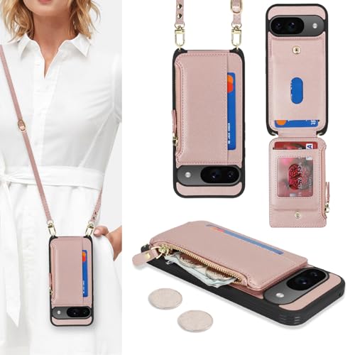 SailorTech Handyhülle für Google Pixel 9 Etui mit Kartenfach, Google Pixel 9 Pro Hülle mit Verstellbarer Halskette, Google Pixel 9/9 Pro Handytasche mit Reißverschluss Geldbörse-Roségold