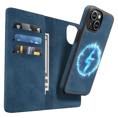 OASISBLUE iPhone 15 Hülle,[2 in 1 Magnetisch Abnehmbar] Kabelloses Laden Kompatibel Stoßfest Schutzhülle Lederhülle Klapphülle Handyhülle für iPhone 15 - blau