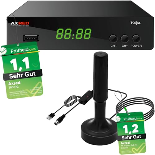 [ Test 2X SEHR GUT *] AXRED T90 HD DVBT2 Receiver + AX Magnes DVB-T/DVB-T2 Antenne mit Verstärker 30dBi für innen außen, mit PVR Aufnahmefunktion, für DVB T2 TV Fernseher Radio DVBT, DVB T Box
