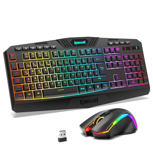 Redragon S101M-KS Kabelloses Gaming Tastatur und Maus mit Tri-Modi, QWERTZ DE Layout, Wiederaufladbarer 4000mAh Akku, RGB Tastatur und 4800 DPI Gaming Maus für Wins, PC, Computer