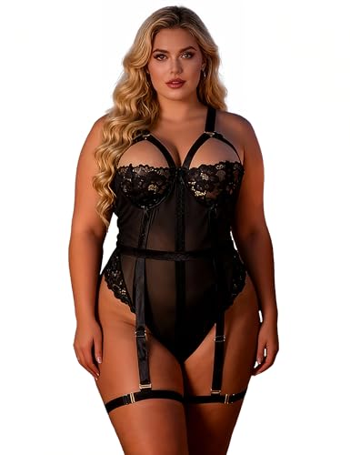 sunshinelady Body Damen Sexy Spitze mit Strapse Dessous Sets Große Größen Mesh Bodysuit Teddy Unterwäsche mit Strumpfhalter Babydoll Reizwäsche für Mollige Lingerie Women Clubwear Schwarz,3XL-4XL