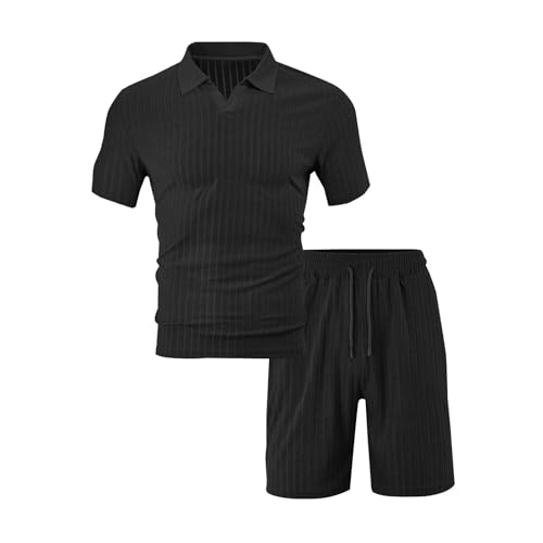 Maskjuwio Poloshirts Für Herren, 2-Teiliges Set Jacquar Sportanzug Revers Tracksuit T-Shirt Und Shorts Sets Trainingshose Mit Kordelzug Und Tasche Gestreift Sweatsuits Einfarbig Sommeranzug