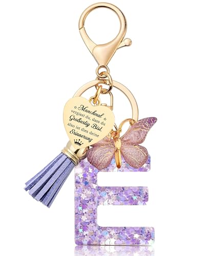 JANGYUHH Schlüsselanhänger mit Buchstabe & Herz Gravur – Harz Anhänger mit Schmetterling & Quaste – Geschenkidee für Frauen, Mädchen, Geburtstag, Weihnachten, Valentinstag-E