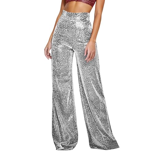 Glitzer Hose Damen Pailletten Glitzerhose Lang Damen Pailettenhose Weites Glitzer Schlaghose Silber High Waist Elegant Lang Glitzerhosen Frauen Freizeithose Outfit Disco Pants 70Er Karneval KostüM