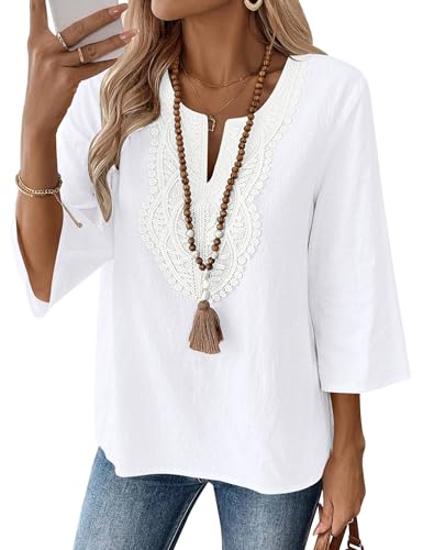 Rapbin Weisse Blusen Damen Elegante Oberteile 3/4 Arm V Ausschnitt Baumwolle Blusen Frühling Sommer Outfit Modern Tunika Weiß L