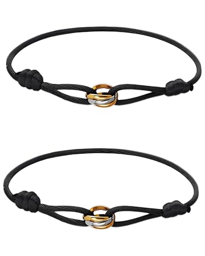 Fokroin Segeltau Damen Armband, 2 Stück, Dreifarbig Ring, Schwarz Glücksarmbänder, Kordelarmband mit Ring, Handgemacht, Wasserfest, Verstellbar, fur Partner Geschenke, Freundschaftsarmbänder