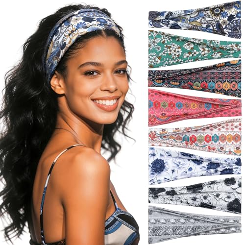 Awumbuk Haarband Damen, Stirnband Breit Gekreuzt, 8er Set, Muster, Boho-Vintage Stil, Elastisch und Weich, für Sport Yoga Alltag