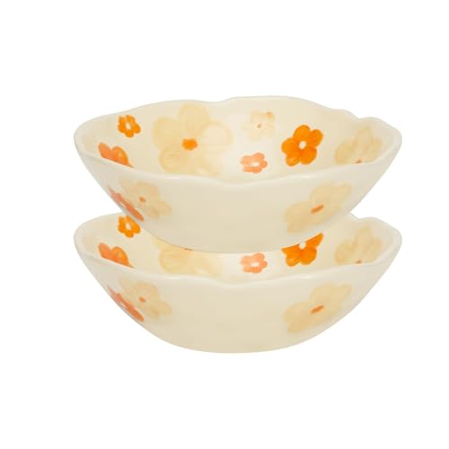 Koythin Salatschüsseln 2er Set, Süße Orange Blume Keramikschalen, Cremegelbe Servierschale für Nudeln, Müsli, Obst, Suppe, Reis, spülmaschinen- und mikrowellengeeignet (Orange Flower 2er Set)