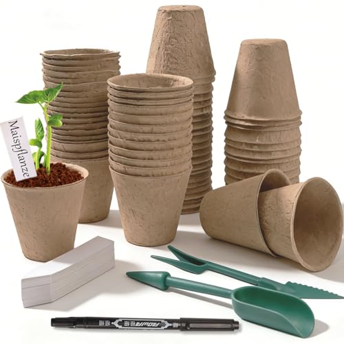 70 Stück Anzuchttöpfe 8 cm, Biologisch Abbaubare Pflanztöpfe Zur Anzucht, Torffreie Runde Aussaattöpfe, Mit 70 Kunststoff-Pflanzenetiketten, Einem Paar Pikierwerkzeuge Und Einem Schwarzen Filzstift