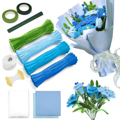 IJIAMY 400 Stück Pfeifenreiniger Blumen Set, Pfeifenputzer Blumen Zum Basteln, Mit Grüne Blumenstöcke, Klebebandrollen, Klebestifte, Anleitungen (Blau)