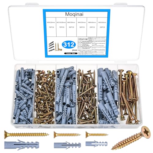 Moqinai 312 Stück Dübel Schrauben Set, Gipskarton Schrauben Dübel Set, Selbstbohrende Holzschrauben Dübelset, Wanddübel und Schraubenset, Betonschrauben Gipskartondübel für Beton Ziegel Trockenbau