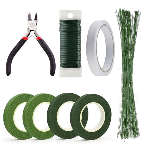 4 Rollen Floristenband 27m, 100 Pcs Blumendraht Floristik Kreppband Floristikdraht Grün Steckdraht, Draht-Schneider und Doppelseitigem Klebeband für Wrapping Blumensträuße und floralen Handwerken