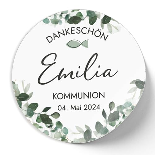 Mimi und Anton KOMMUNION DANKESCHÖN Aufkleber personalisiert mit deinem Wunschnamen | 12x Sticker rund 5 cm | Vielen Dank KOMMUNION Deko Sticker | Eukalyptus Greenery