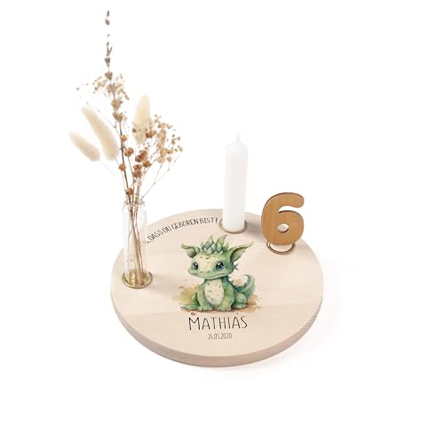 Nord-Kind® personalisierter Geburtstagsteller aus Holz mit Kerzen, Vase & Zahlen [20cm Ø]| Geburtstagsteller Holz | Geburtstagsteller personalisiert | Kerzenteller Geburtstag Kinder | Drache 1