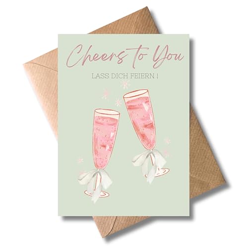 Geburtstagskarte „Cheers to You – Lass dich feiern!“ – Stilvolle Grußkarte mit roséfarbenen Sektgläsern & Schleifen – Für Freundinnen, Familie & Kolleginnen – DIN A6 – Premium – Mit Umschlag