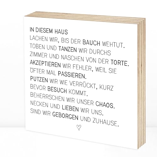 Wunderpixel® Holzbild In diesem Haus - 15x15x2cm zum Hinstellen/Aufhängen, Spruch auf Holz - schwarz-weißes Wand-Bild Aufsteller zur Dekoration oder Geschenk-Idee