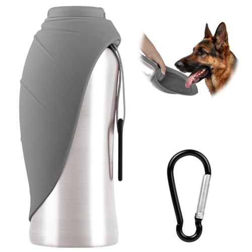 vsshe Hundetrinkflasche für Unterwegs, 700ml Isolierte Edelstahl Hundetrinkflasche mit Klappnapf, Tragbare Haustier Trinkflasche Auslaufsicher, Hunde Wasserspender für Spaziergang Wandern Campen Auto