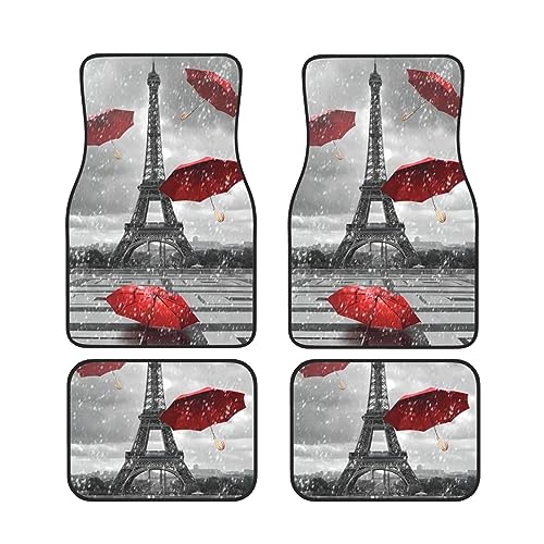 OPSREY Eiffelturm roter Regenschirm bedruckt Universal Auto Fußmatten Set Auto Fußmatten Teppich 4 Stück Set