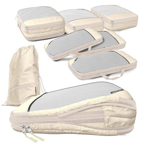 Packtaschen Kompression für Koffer und Rucksack [7-teilig] mit Packbeutel - mehr Platz im Koffer oder Backpack durch Kompression – Packwürfel Kompression für deine Reise Ausrüstung (beige)