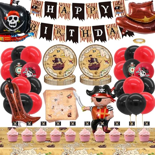 DXLing 81 Stück Piraten Geburtstag Deko Set Partyzubehörset Piraten Deko Kindergeburtstag mit Große Piratenschiff Folienballon Pappteller Servietten Banner Luftballon Kuchenfähnchen Skelett - 20 Gäste