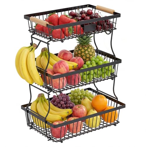 Dwitkul Obst Etagere 3 Stöckig, Abnehmbarer Obstkorb Etagere, Obstschale Etagere mit Holzgriff für Obst Aufbewahrung, Gemüse Aufbewahrung (Schwarz)
