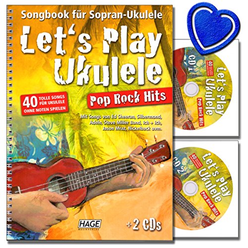 Let's Play Ukulele - Songbook für Sopran-Ukulele mit 2 CDs - Sammlung von 40 bekannten und beliebten Hits - Lehrprogramm/Lehrvideo mit bunter herzförmiger Notenklammer
