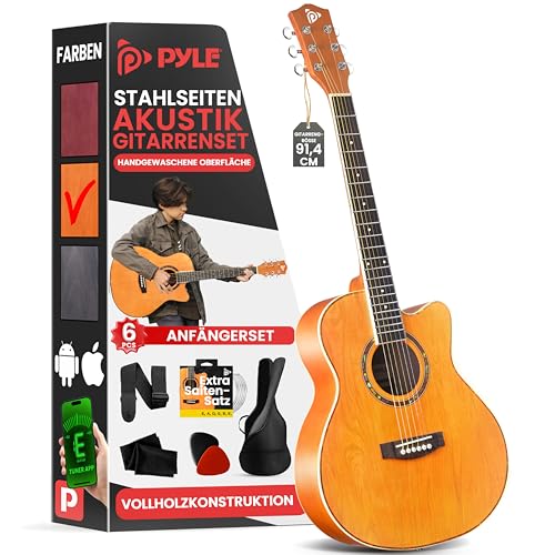Pyle Akustikgitarren-Set mit Stahlsaiten, 3/4 Juniorgröße, natürliches Lindenholz, mattes Finish, Instrument mit Gigbag, Stimmgerät, extra Saiten, Plektren, Gurt, für Anfänger, Erwachsene