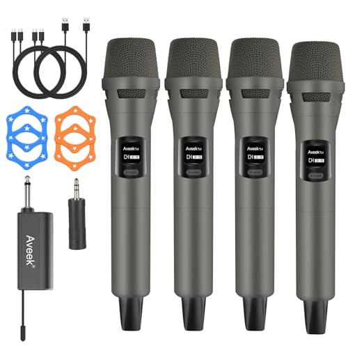 Aveek Funkmikrofon 4er Set, Professionelle Kabelloses Karaoke Mikrofon Set, Wiederaufladbar mit USB-C, 6,35mm/3,5mm Anschluss, Plug & Play für Lautsprecher, Party, Gesang, 30m Reichweite