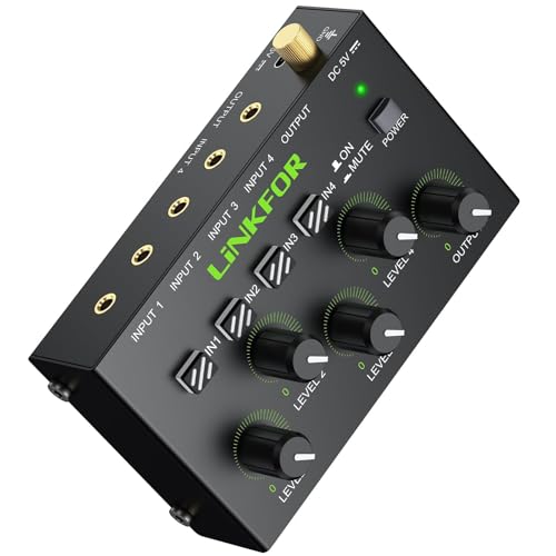 LiNKFOR 4-Kanal 3.5mm Activemischer, 4-IN-1-Out Audiomischpult Stereo Mixer mit Master Volume Zertifiziertem Netzteil, Geräuscharm Unabhängige Lautstärkeregelung für Verstärker PC Abspielgeräte