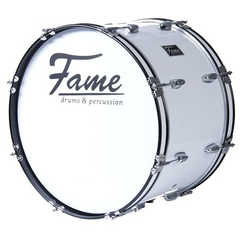 Fame Marching Bass Drum 20"x12", Weiß, 7-Lagen Lindenholz Kessel, Inklusive Tragegurt & Beater, Schaumstoff-Dämpfringe, Prägnanter Klang, Ideal für Einsteiger in Marschierende Percussion