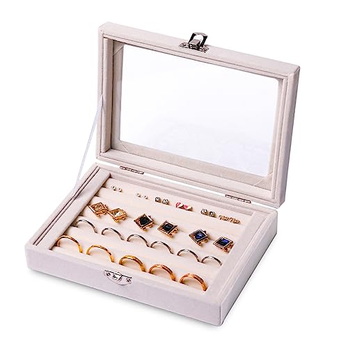 Frebeauty Ringe/Ohrring-Organizer-Tablett mit transparentem Deckel, 7 Fächer, Samt-Schubladeneinsatz, Schmuck-Aufbewahrungsbox, Schmuck-Vitrine, Schmuckkästchen, Geschenk (Beige,7 Fächer)