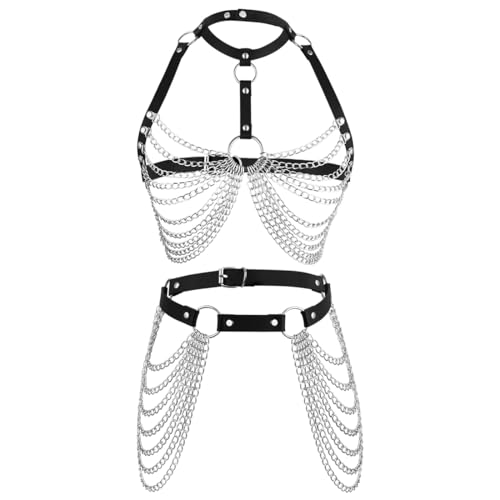 1 Satz Körperkette, Festival Outfit Damen, Gothic Schmuck, Bauchkette, Body Chain Sexy Taillenketten, Punk Leder Truhe Kette Schwarz, Geschichtet BH Ketten Mehrschichtig Körperketten Nachtclub