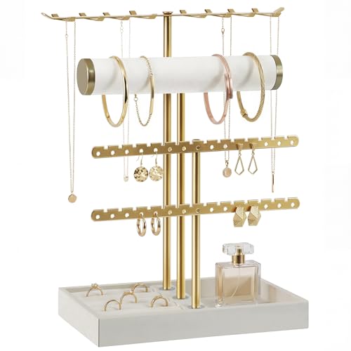 VIRETH HAUS Schmuck Organizer 4 Ebenen, Schmuckständer aus Metall in Gold mit Beigem Samt-Tablett, Schmuckaufbewahrung Display für Halsketten, Armbänder, Ohrringe, Ringe & Uhren, Geschenk für Frauen