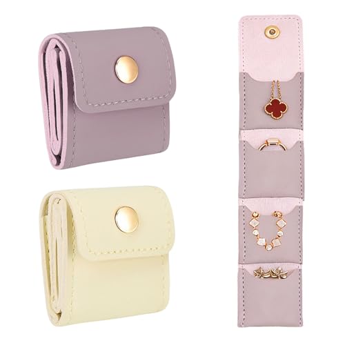 KERYBW 2 Stück Generisch Reise Schmucktasche, Faltbarer Schmuckbeutel Organizer, Kompakte Mini Reisetasche für Ohrringe, Halsketten, Ringe, für Reise Festtagsgeschenk (PU-Leder Gelb + Lila)