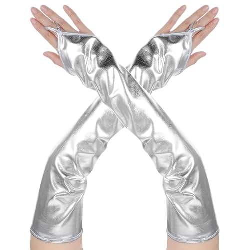 Fingerlose Handschuhe Lange Metallic Silber Halloween Damen Discokugel Kostüm Kunstleder Goth Rave Cosplay Punk Prom Lange Handschuhe Fingerlos Damen Leder Alien Kostüm Zubehör für den Abschlussball