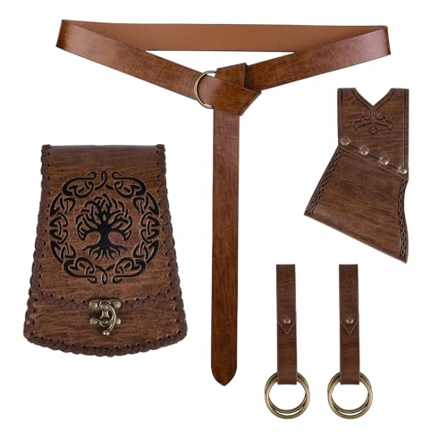 HiiFeuer 5-teiliges Schwertfrosch-Set–Wikinger-Kostümzubehör mit Norwegischer Gürteltasche, Mittelalter-Gürtel & Renaissance-Rockhalter für Ren Faire (Braun A)